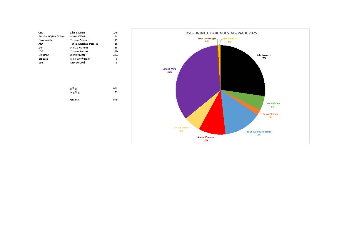 Die Podiumsdiskussion am Vormittag zog über 1100 junge Menschen aus verschiedenen Schulen an. Der Präsident des Bayerischen Jugendrings, Philipp Seitz, war ebenfalls anwesend und begleitete die Veranstaltung. Die Direktkandidierenden aus unserem Wahlkreis, darunter Silke Launert (CSU), Anette Kramme (SPD), Inken Bößert (Grüne), Tobias Matthias Peterka (AfD), Thomas Hacker (FDP) und Jannick Metz (Linke), nahmen an den Diskussionen teil und gaben ihre Stellungnahmen zu verschiedenen Themen ab. Diese umfassten Jugend, Mobilität & Klima, Wirtschaft sowie Migration & Soziales. Im Anschluss hatten die jungen Menschen die Möglichkeit, an der U18-Bundestagswahl teilzunehmen. U18 ist das Pendant zu den „echten“ Wahlen: Kurz vor der jeweiligen Europa-, Bundestags- oder Landtagswahl haben landesweit alle Kinder und Jugendlichen unter 18 Jahren die Möglichkeit, ihre Stimme abzugeben. U18 soll, in Vorbereitung auf die Wahlen, Anlass für selbstorganisierte politische Bildung bieten. Im Optimalfall kann die U18-Wahl sogar in zwei Richtungen wirken: Junge Menschen beschäftigen sich mit Politik – und bringen junge Themen in die Politik ein.
