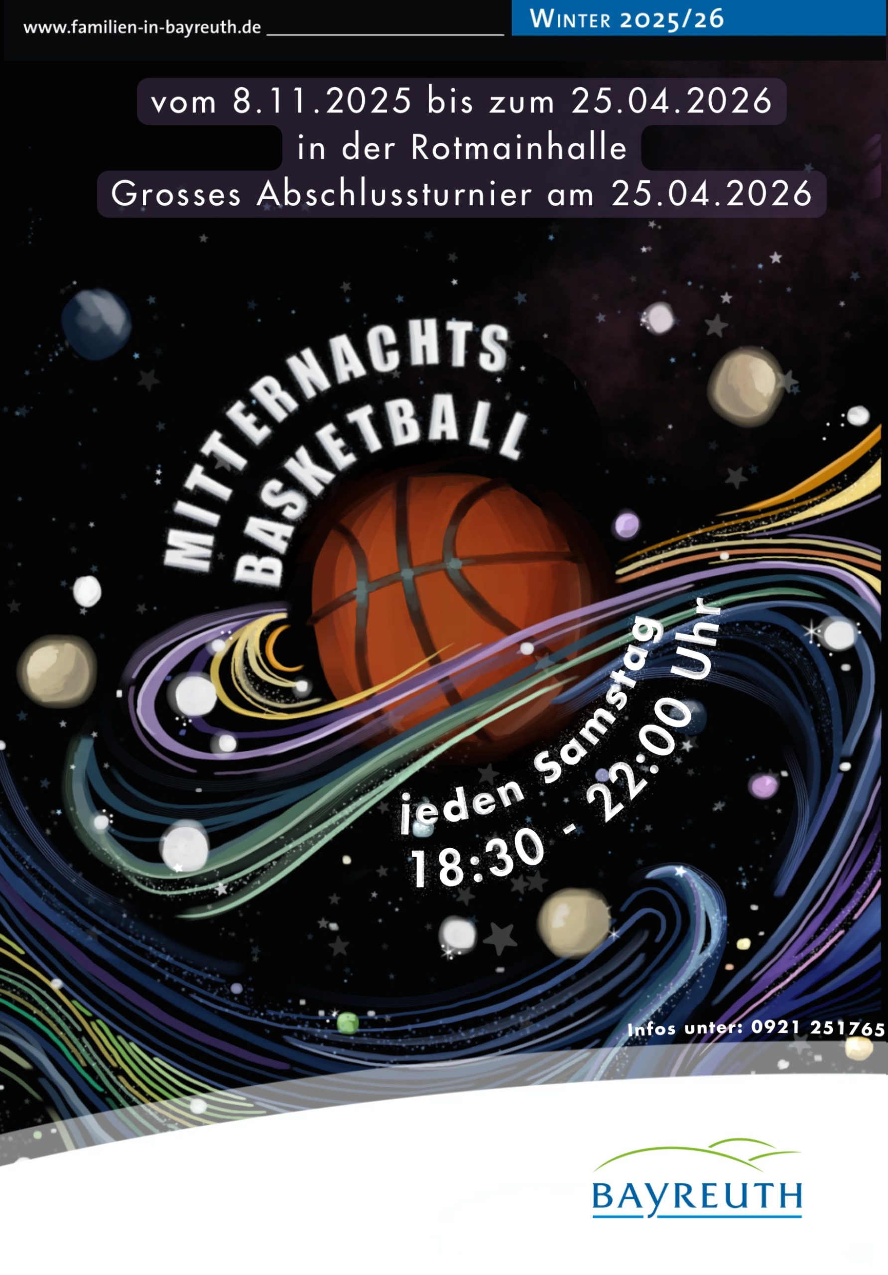 Jeder, der Freude am Basketballspielen hat, kann von dort nahezu an jedem Samstagabend im Winterhalbjahr von 18.30 Uhr bis 22.00 Uhr die Rotmainhalle dafür nutzen. Ausnahmen bilden die Winterpause vom 22.12.2025 bis zum 04.01.2025 und eine Hallenbelegung am 18.04.2026, weshalb an diesen Samstagen kein Mitternachtsbasketball stattfinden kann. Das Amt für Kinder, Jugend und Familie bietet diese kostenlose Veranstaltung für alle Altersgruppen bis zum 25. April 2026 (Abschlussturnier) an.